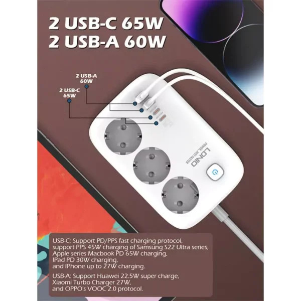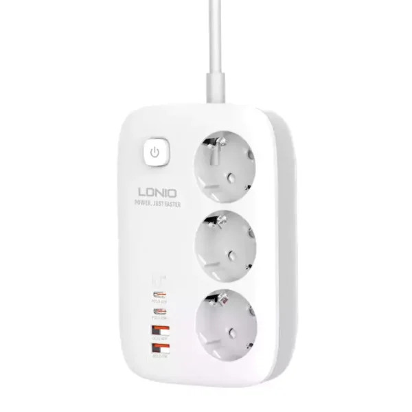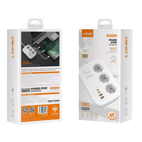 چند راهی برق LDNIO مدل SE3436 با 3 پریز استاندارد و 2 پورت USB و 2 پورت TYPE-C هوشمند، مناسب برای شارژ سریع موبایل، تبلت و لپتاپ؛ طراحی ایمن با سیستم محافظت در برابر نوسانات برق.