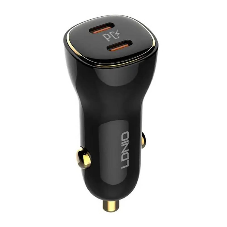 شارژر فندکی LDNIO مدل C104 با دو پورت TYPE-C و قابلیت شارژ سریع، مناسب برای شارژ همزمان موبایل و تبلت در خودرو؛ طراحی جمعوجور، ایمن و مقاوم در برابر نوسانات برق خودرو.