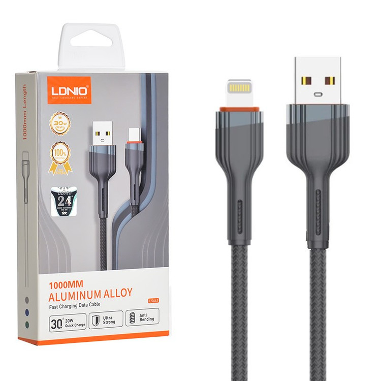 کابل شارژ LDNIO مدل LS641 با رابط لایتنینگ و پشتیبانی از فناوری فست شارژ، مناسب برای شارژ سریع موبایل و تبلت؛ قابلیت انتقال دیتا با سرعت بالا و طراحی مقاوم با طول عمر زیاد.