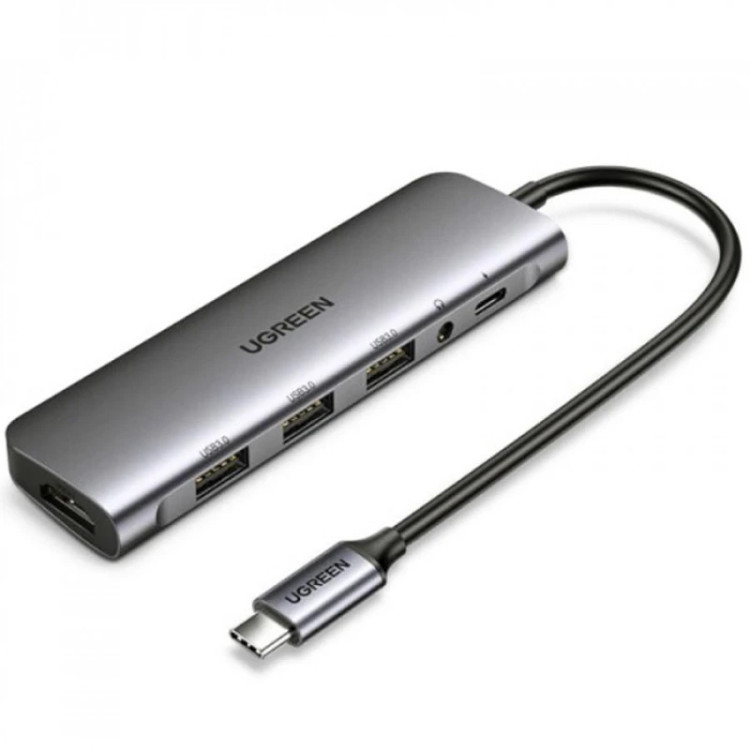 هاب UGREEN مدل CM136-80132 با طراحی آلومینیومی، شامل پورت HDMI با پشتیبانی تا 4K@30Hz، سه پورت USB-A 3.0 با سرعت 5Gbps، جک صوتی 3.5 mm (AUX)، و پورت USB-C PD تا 100 وات؛ مناسب لپتاپ، تبلت و گوشیهای دارای پورت Type-C، برای کاربری اداری، مولتیمدیا و استفاده روزمره.