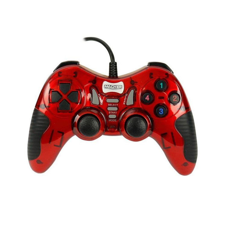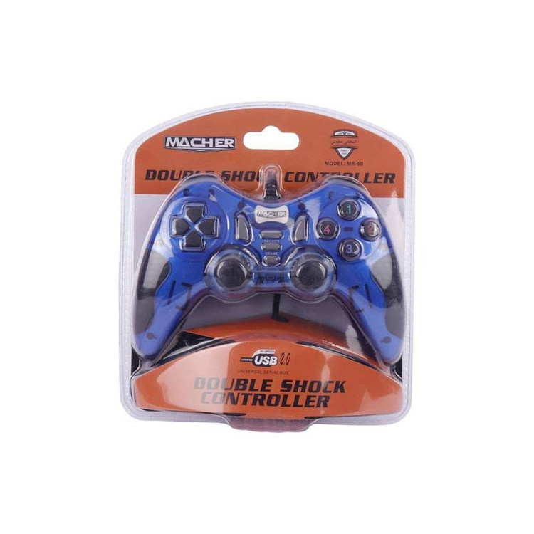 دسته بازی Macher مدل MR-60 با طراحی فانتزی در رنگ بندی مشکی، قرمز، سبز، آبی، سفید مناسب برای بازی های رایانه ای، مخصوص گیمرهای حرفه ای و علاقمندان و اشخاصی که حرفه ای بازی های رایانه ای را دنبال میکنند است. نوع اتصال این دسته بازی کامپیوتر تک حرفه ای Macher مدل MR-59 سیمی بوده و از طریق درگاه USB کامپیوتر یا لب تاپ متصل و با طراحی ارگونومی و ساختار مهندسی ساخته شده از نوعی پلاستیک مرغوب و ترکیب با چرم های مهندسی که علاوه بر شکیل شدن آن متناسب قسمت های در تماس با دست می باشد که از تعریق و لیز خوردن آن در صورت استفاده طولانی جلوگیری میکند. وجود 20 دکمه شامل چهار کلید اصلی بعلاوه 4 کلید جهت دار و چهار دکمه کمکی در شانه های و با دو کنترلر آنالوگ 360 درجه) همچنین 6 کلید کمکی شامل ( Turbo، Clear،Start ، Select ، Mode) در قسمت جلو بر روی گیم پد قرار داده شده است و برای کمک به بازی کننده برای متوقف کردن و فعال و یا غیرفعال کردن شک دسته به بکار رفته است.