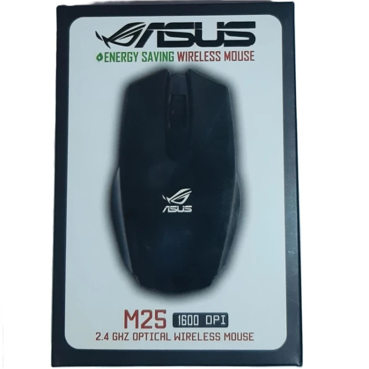 ماوس بی سیم ایسوس مدل M25 ،بدنه ساخته شده از جنس پلاستیک مقاوم در برابر آسیب های فیزیکی احتمالی_اتصال بصورت بی سیم از طریق دانگل USB، طراحی شده به صورت ارگونومیک_تامین انرژی محصول از طریق دو عدد باتری نیم قلمی، برخورداری از کلید روشن و خاموش_مجهز به حسگر اپتیکال با حداکثر میزان دقت 1600DPI