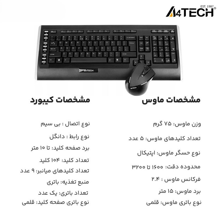 کیبورد و ماوس «9300F» ساخته شده توسط شرکت «ای فورتک» است. این محصول به صورت بی سیم طراحی شده دارای فرکانس 2.4 گیگاهرتز و شعاع رادیویی 15 متر است. این محصول در تمامی سطوح مانند شیشه، چوب، پارچه خز دار و... قابل استفاده است.میزان دقت این محصول از 800 تا 2000 DPI بوده دارای برد 15 متر است و وزن بسیار کمی دارد. ماوس این محصول دارای 3 کلید است برد مفید آن 15 متر است و میزان دقت این محصول تا 2000 DPI است و بدون نیاز به پد ماوس قابل استفاده است.