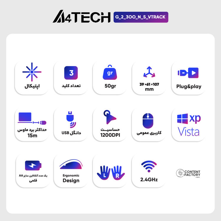 ماوس بی سیم ای فورتک مدل G3-200NS تولید شرکت ای فورتک است. شرکت ای فورتک جزو یکی از بزرگترین شرکتهای فعال در زمینه تولید تجهیزات کامپیوتری در جهان محسوب میشود. این مدل ماوس طراحی ساده و وزن کمی دارد و به همین دلیل فضای زیادی را اشغال نمیکند و حملونقل آن بسیار آسان است. همچنین این ماوس بهصورت بی سیم کار میکند؛ بنابراین اگر دانشجو هستید و به دنبال خرید یک ماوس بی سیم و سبک میگردید، این مدل ماوس گزینه بسیار خوبی برای شما بهحساب میآید. از دیگر ویژگیهای این محصول میتوان به امکان اتصال از طریق دانگل USB اشاره کرد. شما برای استفاده از این مدل ماوس باید دانگل USB را به کامپیوتر یا لپتاپ خود متصل کنید تا اطلاعات از طریق آن به کامپیوتر شما منتقل شود. وظیفه این گیرنده، دریافت امواج رادیویی از ماوس و انتقال آن به کامپیوتر است. محدوده دقت این مدل ماوس از برند ای فورتک هم بین 800 تا 1600 است بنابراین با توجه به قیمتی که دارد از دقت مناسبی برخوردار است. در نهایت لازم است بدانید که این ماوس با یک باتری قلمی (آلکالاین سایز AA) کار میکند.