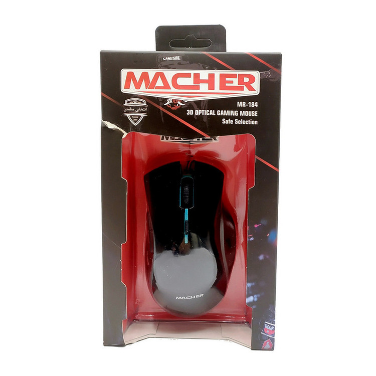 موس سیم دار MR184 مچر با مشخصات مناسب و قیمت مقرون به صرفه خود به راحتی نیاز کاربران را به یک موس بر طرف می کند. این موس از طراحی ارگونومیک شبیه به محصولات گیمینگ بهره می برد و از متریال پلاستیکی برای ساخت آن استفاده شده است. طراحی ارگونومیک موس مچر راحتی کاربر را در استفاده های طولانی مدت موجب می شود. شرکت مچر علاوه برا سه کلید اصلی موس از 3 کلید دیگر هم برای این محصول استفاده کرده که یکی از این کلید ها امکان تنظیم کردن سرعت سنسور اپتیکال را به کاربر ارائه می کند. سنسور به کار گرفته شده در MR184 حرکات دست را با دقت 3600 DPI به رایانه منتقل می کند. انتقال اطلاعات مربوط به حرکت دست هم توسط کابل 1٫5 متری USB به رایانه صورت می گیرد. این محصول با اکثر سیستم عامل ها سازگار بوده و از قابلیت Plug And Play نیز پشتیبانی می کند.